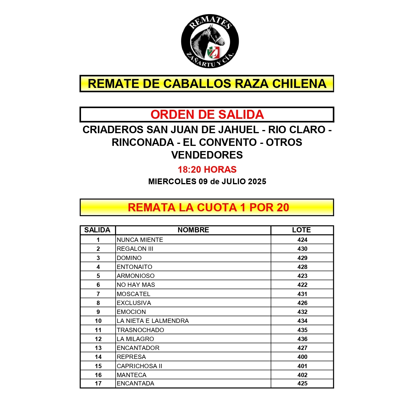 | LOTE | NOMBRE | AÑO | PADRE | MADRE | |