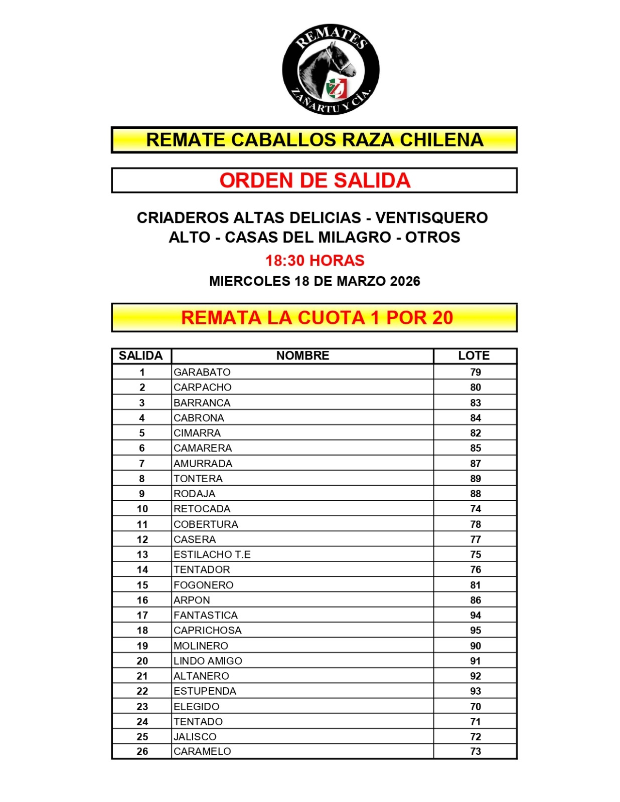 Catálogo (Descraga pdf) ORDEN DE SALIDA VER TRANSMISION DEL REMATE Bases de Compra RX Lote 76 TENTADOR RX Lote 79 GARABATO RX Lote 80 CARPACHO CERTIFICADOS DE PREÑEZ Lotes 87-88-89 Lote 76 TENTADOR Informe Medico Veterinario Lote 79 GARABATO Informe Medico Veterinario Lote 80 CARPACHO Informe Medico Veterinario